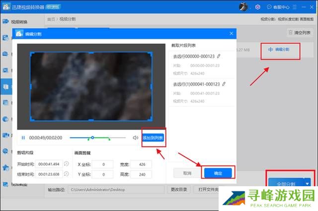 第二步 上传好视频文件之后,点击【编辑分割】按钮,在弹出的页面中进行分段。选择好需要分段的位置后,点击【添加到列表】,可以重复操作。操作完成之后,点击右下角的【确定】按钮。就会返回到上一页面,点击【全部分割】即可。