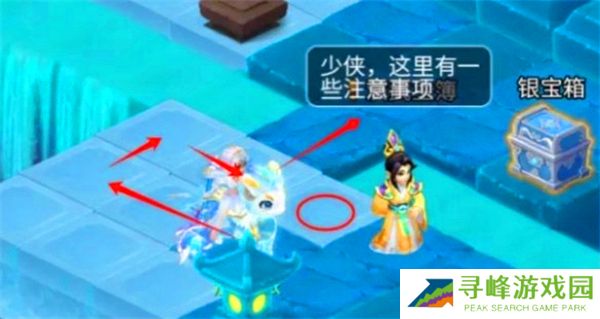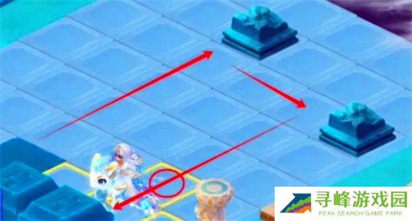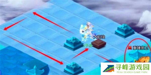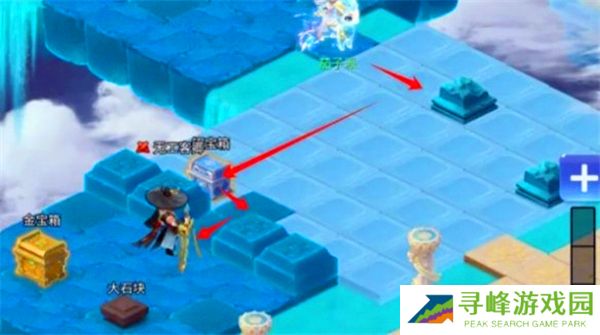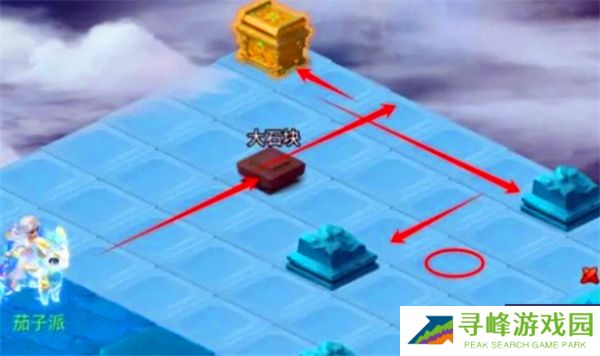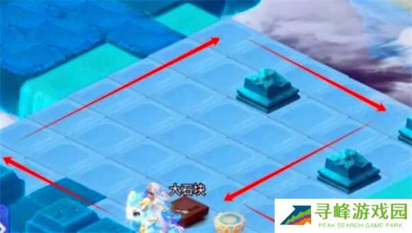 将石块放置在另一个红色圆圈处,人物按照红色箭头走。
