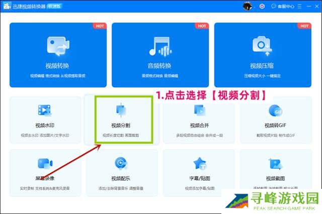 步骤一 首先打开电脑桌面的【迅捷视频转换器】,进入首页后,我们可以看到有许多功能选项,找到【视频分割】的功能,点击选择。