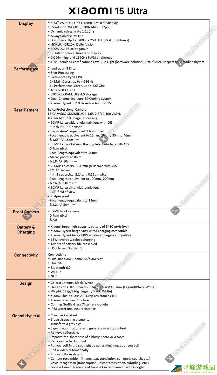 近日,国际版小米15 Ultra手机的详细规格信息被知名消息源@Sudhanshu1414在X平台上曝光。据悉,这款手机的国际版本与国内版本在电池容量上存在些许差异。