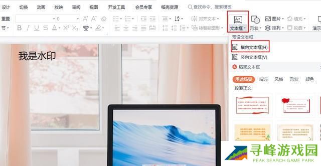 使用PPt打开需要加水印的图片后,点击【文本框】下的【横向文本框】,就可以为图片添加水印内容啦。