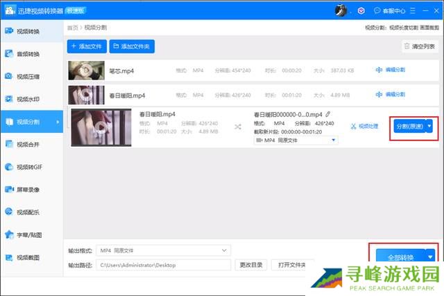 选择好需要分割的部分之后,我们可以看到在原视频的下方会显示出一个新的片段,点击视频右侧的“分割”或者下方的“全部转换”就完成了。