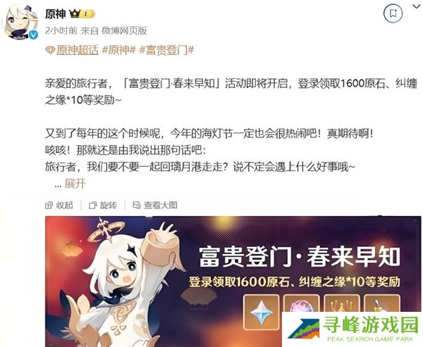 米哈游昨日1月20日宣布,旗下热门游戏原神将启动富贵登门·春来早知特别活动。活动期间,玩家可通过参与开门迎财·累计登录和旧忆新桃·海灯节答谢活动,获得1600原石、10个纠缠之缘等丰厚奖励。