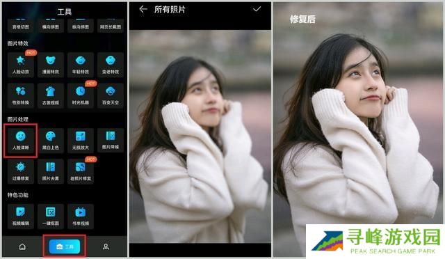 VideoLab是一款手机视频图片美化工具,支持许多的图片特效,也支持人脸清晰功能,我们打开之后在【工具】栏找到【图片处理】-【人脸清晰】,上传我们的模糊照片,照片就变高清了。