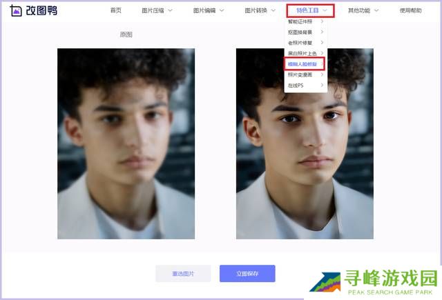 我们打开之后点击【特色功能】选择【模糊人脸修复】功能,上传模糊照片之后它就会自动修复好,修复完成之后点击保存就可以啦~