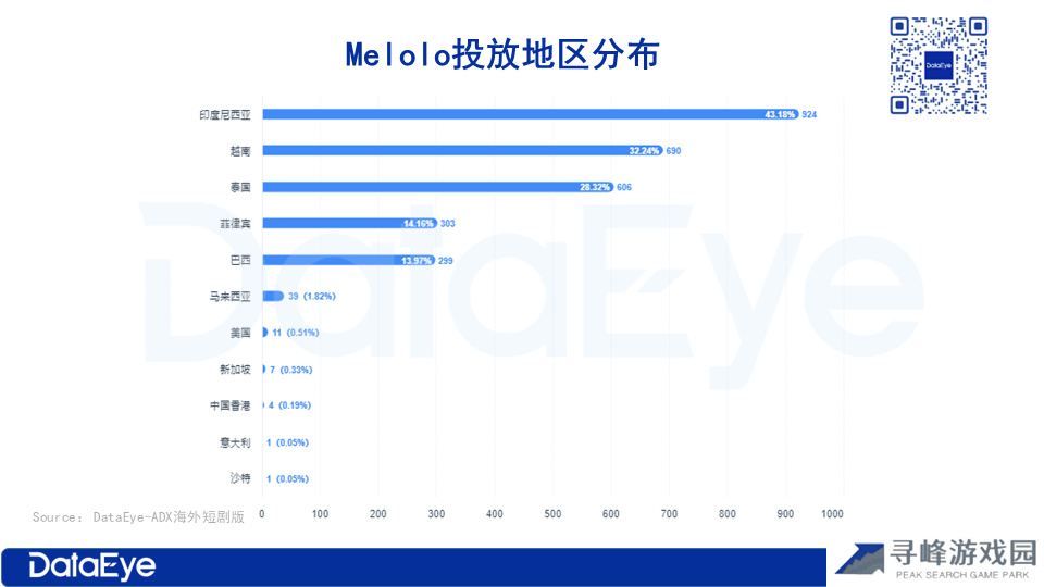 从投放市场来看,Melolo主要集中在东南亚地区。其中,印度尼西亚市场的投放素材量位居首位,占比达到43.18%,越南和泰国分别以32.24%和28.32%的素材投放比例紧随其后。这些投放地区与下载量趋势基本一致,显示出Melolo在东南亚市场的重点布局。