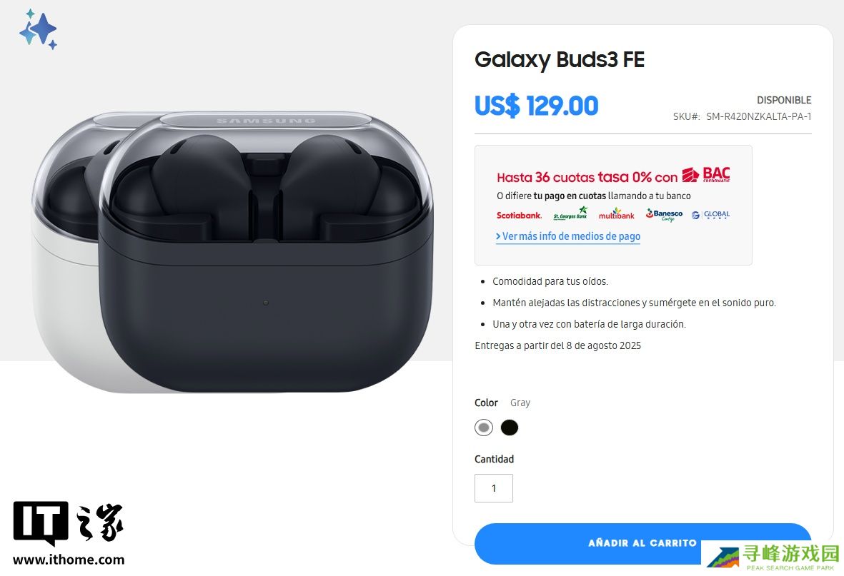 本站 8 月 7 日消息,科技媒体 Android Headline 今天(8 月 7 日)发布博文,报道称三星最亲民耳机继任者 Galaxy Buds3 FE 已现身拉丁美洲官网,共有灰色和黑色两种颜色,产品售价为 129 美元(本站注:现汇率约合 927.3 元人民币)。