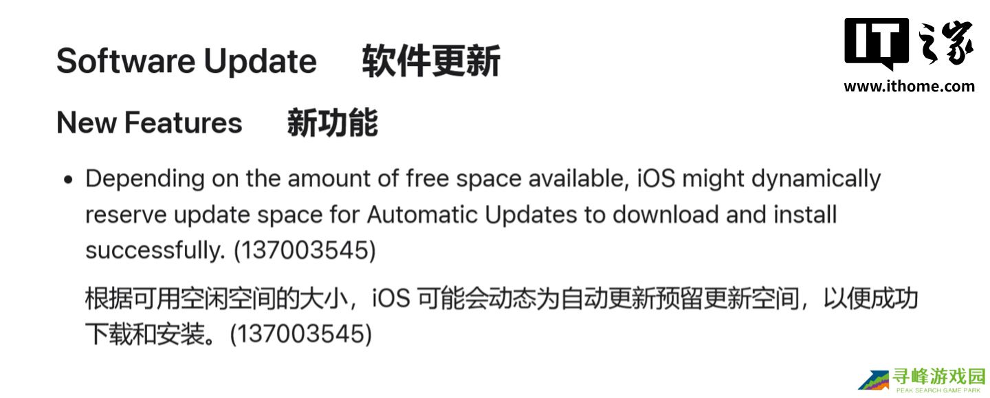 本站 6 月 14 日消息,科技媒体 MacRumors 今天(6 月 14 日)发布博文,报道称苹果官方更新的 iOS 26 Beta 1(内部版本号 23A5260u)针对自动更新需求,将推动态存储空间预留功能。