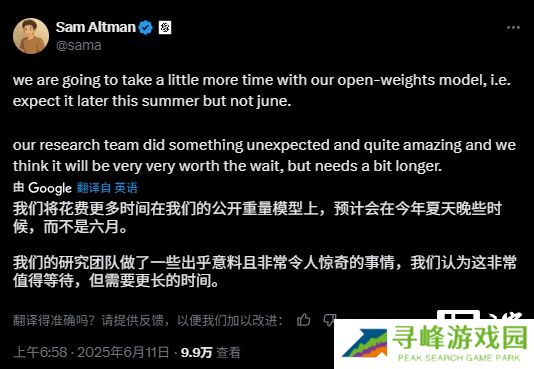本站 6 月 11 日消息,OpenAI 的开源模型发布计划出现了新的调整。该公司首席执行官山姆・奥尔特曼(Sam Altman)在周二于 X 平台上发布的一篇帖子中宣布,原计划于今年初夏推出的开源模型预计将推迟至夏末发布,不会在 6 月与公众见面。
