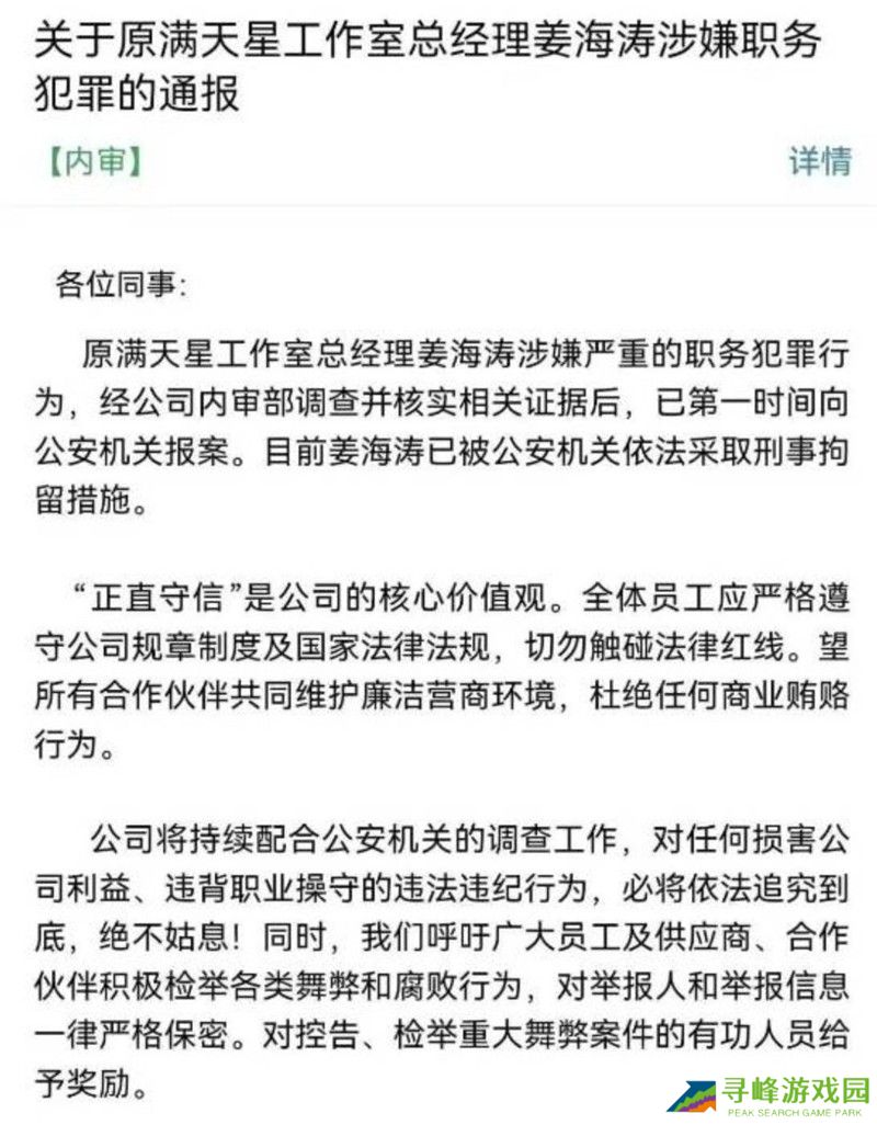 据游戏陀螺报道,中手游内部发布公告称,原满天星工作室总经理姜海涛涉嫌严重的职务犯罪行为,经公司内审部调查并核实相关证据后,已第一时间向公安机关报案。目前姜海涛已被公安机关依法采取刑事拘留措施。