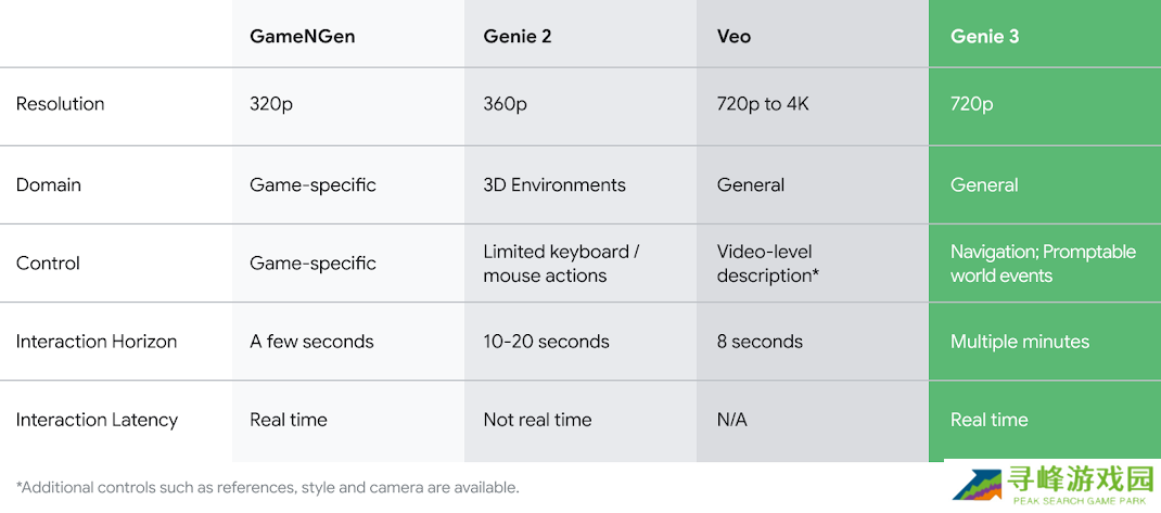 相比较前代模型(如 Genie 1/2)和视频生成模型(如 Veo 2,Veo 3 对直觉物理学的深刻理解),Genie 3 是第一个允许实时交互的世界模型,同时与 Genie 2 相比,其一致性和真实感也得到了提升。