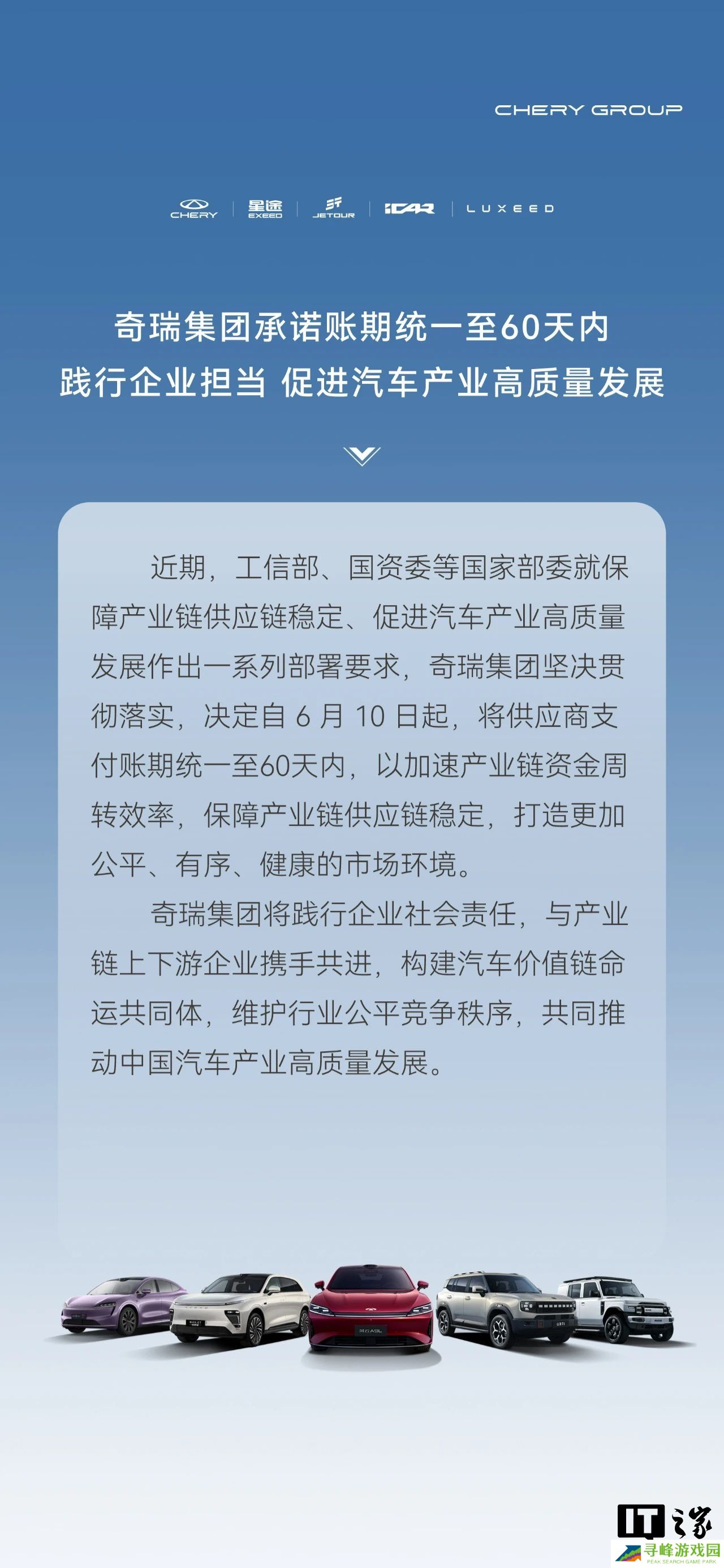 本站 6 月 11 日消息,奇瑞集团今日发文表示,近期,工信部、国资委等国家部委就保障产业链供应链稳定、促进汽车产业高质量发展作出一系列部署要求,奇瑞集团坚决贯彻落实,决定自 6 月 10 日起,将供应商支付账期统一至 60 天内,以加速产业链资金周转效率,保障产业链供应链稳定,打造更加公平、有序、健康的市场环境。