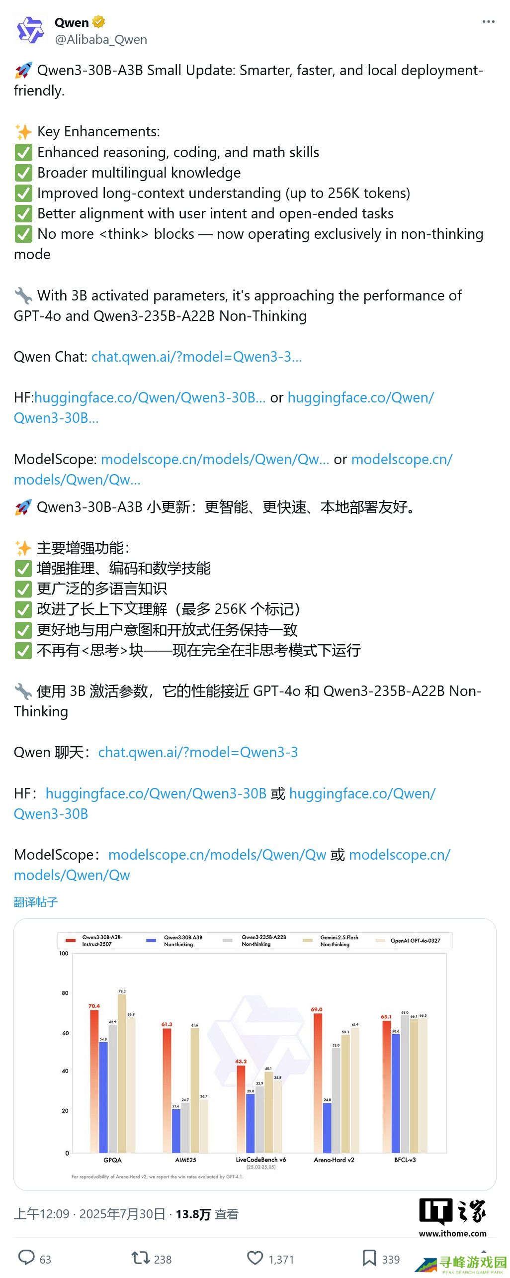 本站 7 月 30 日消息,阿里通义千问今天(7 月 30 日)在 X 平台发布推文,宣布推出 Qwen3-30B-A3B 非思考模式的更新版本,命名为 Qwen3-30B-A3B-Instruct-2507。