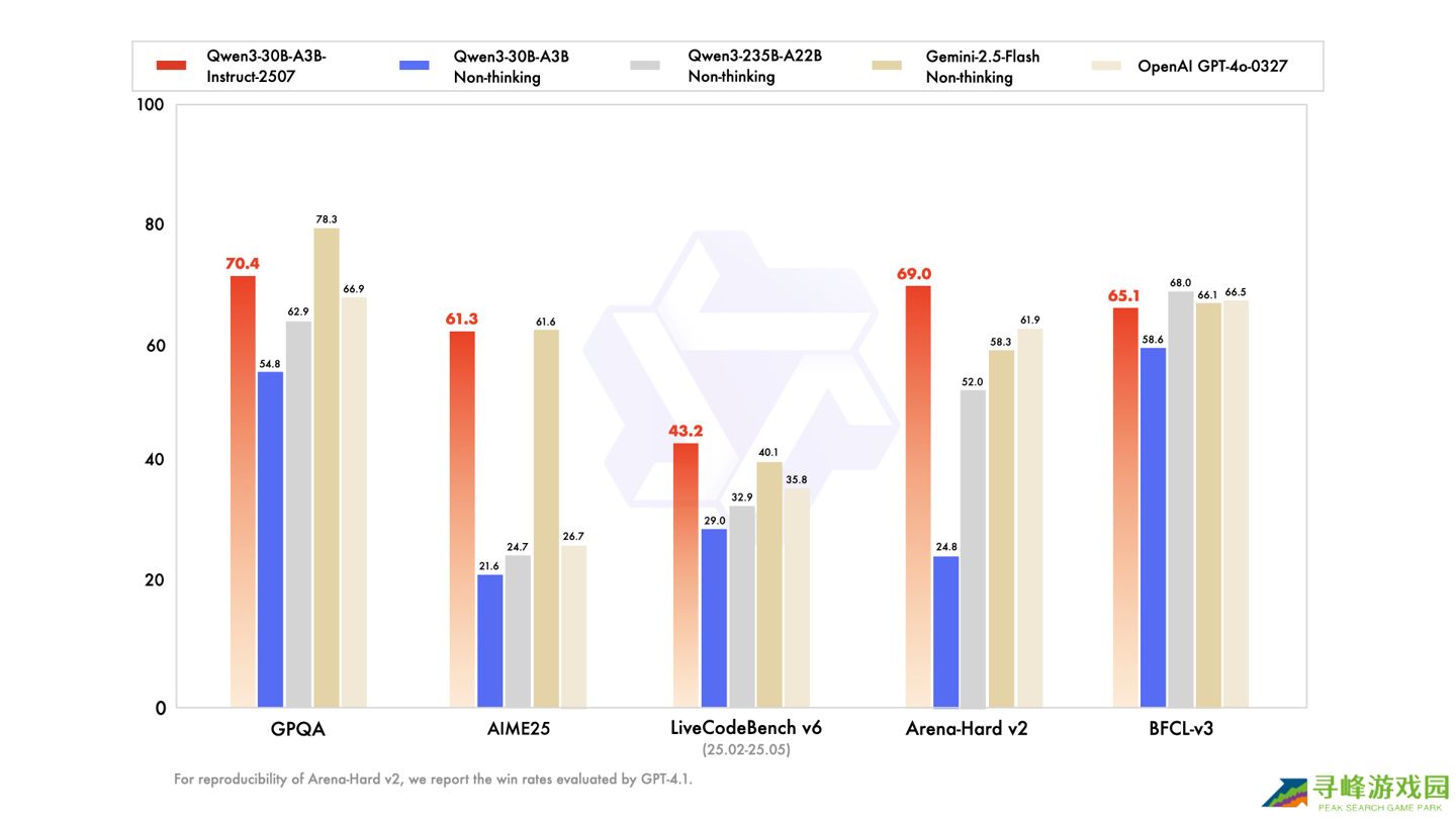 | Deepseek-V3-0324 | GPT-4o-0327 | Gemini-2.5-Flash 非思考 | Qwen3-235B-A22B 非思考 | Qwen3-30B-A3B 非思考 | Qwen3-30B-A3B-Instruct-2507 | 知识MMLU-Pro81.279.881.175.269.178.4MMLU-Redux90.491.390.689.284.189.3GPQA68.466.978.362.954.870.4SuperGPQA57.351.054.648.242.253.4 推理AIME2546.626.761.624.721.661.3HMMT2527.57.945.810.012.043.0ZebraLogic83.452.657.937.733.290.0LiveBench 2024112566.963.769.162.559.469.0 编程LiveCodeBench v6 (25.02-25.05)45.235.840.132.929.043.2MultiPL-E82.282.777.779.374.683.8Aider-Polyglot55.145.344.059.624.435.6 对齐IFEval82.383.984.383.283.784.7Arena-Hard v2*45.661.958.352.024.869.0创意写作 v381.684.984.680.468.186.0WritingBench74.575.580.577.072.285.5 代理BFCL-v364.766.566.168.058.665.1TAU1-Retail49.660.3#65.265.238.359.1TAU1-Airline32.042.8#48.032.018.040.0TAU2-Retail71.166.7#64.364.931.657.0TAU2-Airline36.042.0#42.536.018.038.0TAU2-Telecom34.029.8#16.924.618.412.3 多语言MultiIF66.570.469.470.270.867.9MMLU-ProX75.876.278.373.265.172.0INCLUDE80.182.183.875.667.871.9PolyMATH32.225.541.927.023.343.1