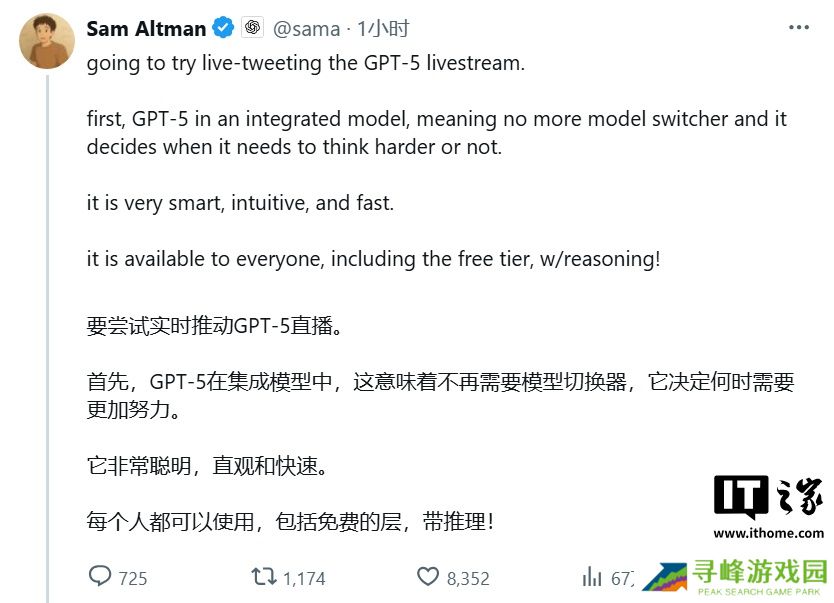 该公司首席执行官山姆・奥尔特曼(Sam Altman)在 X 平台发布推文,将 GPT-5 模型的亮相,比作苹果初代 iPhone,认为用户在体验过后就不会放手。这一代语言模型在推理、准确性和速度上有了显著改进,让互动体验更接近专家。