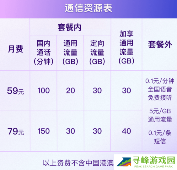 其中,59 元档含 20GB 国内通用流量、100 分钟国内通话、30GB 定向流量等;79 元档含 30GB 国内通用流量、150 分钟国内通话、30GB 定向流量等,还有首充 50 元得 170 元活动。