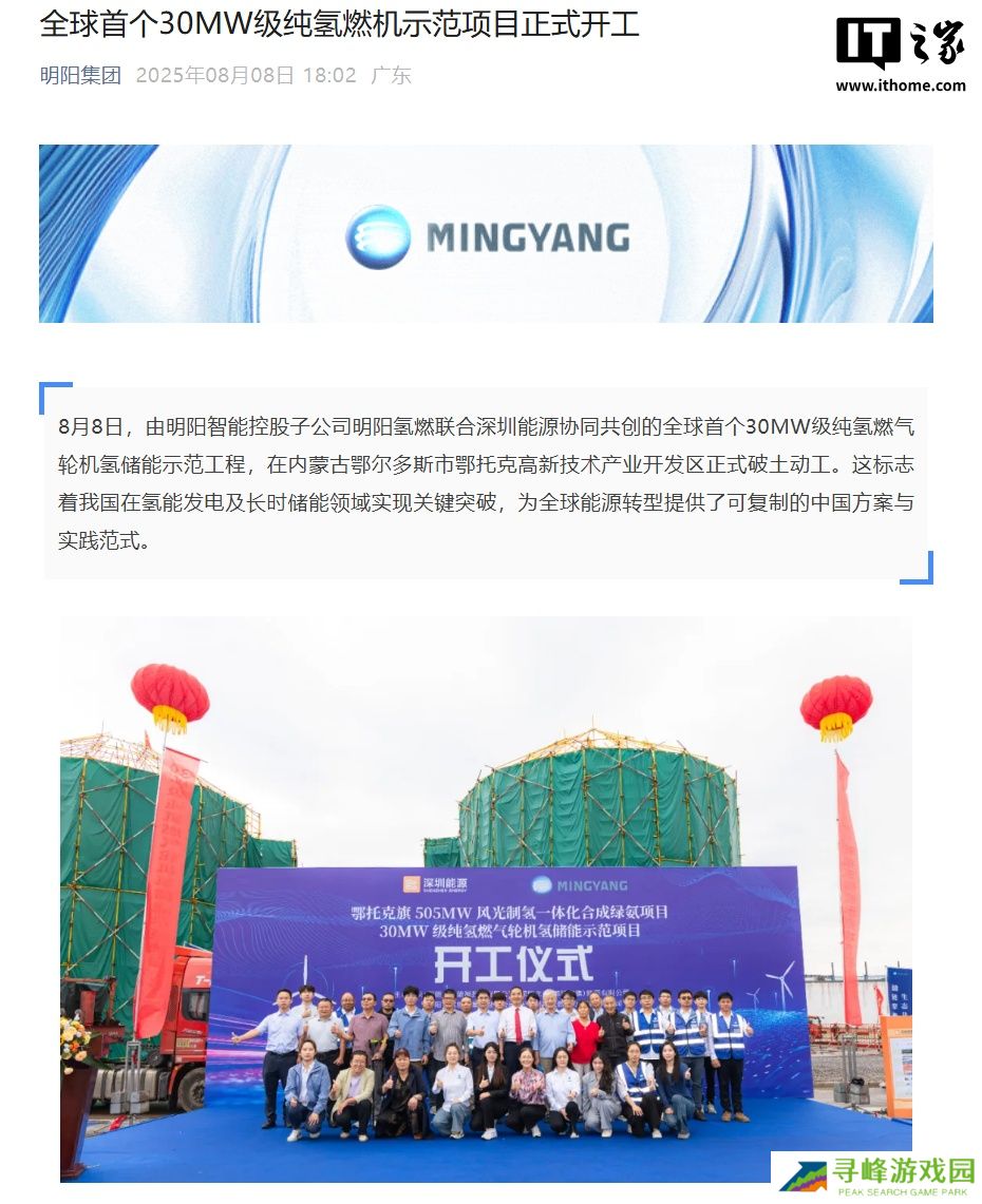 本站 8 月 9 日消息,“明阳集团”官方公众号发布博文,报道称内蒙古鄂尔多斯市鄂托克高新技术产业开发区于昨日(8 月 8 日)启动全球首个 30MW 级纯氢燃气轮机氢储能示范工程,标志着我国在氢能发电及长时储能领域取得关键突破。