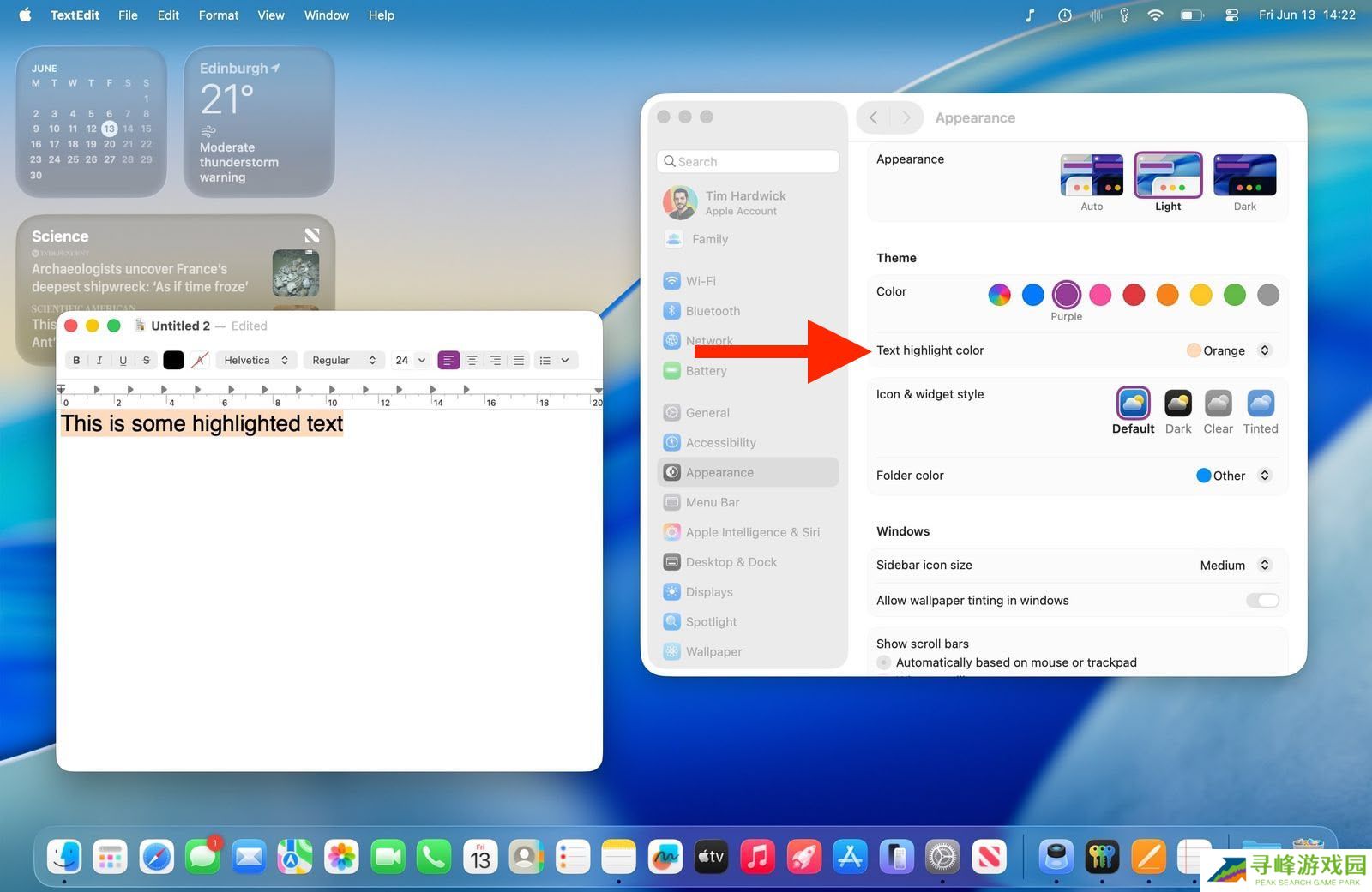 苹果在设置选项中,不仅将“主题色”(Accent Color)调整为更广义的“颜色”(Color),还引入“文本高亮颜色”(Text Highlight Color),来设置高亮文本的颜色,区分按钮、弹出菜单和复选框等界面元素。