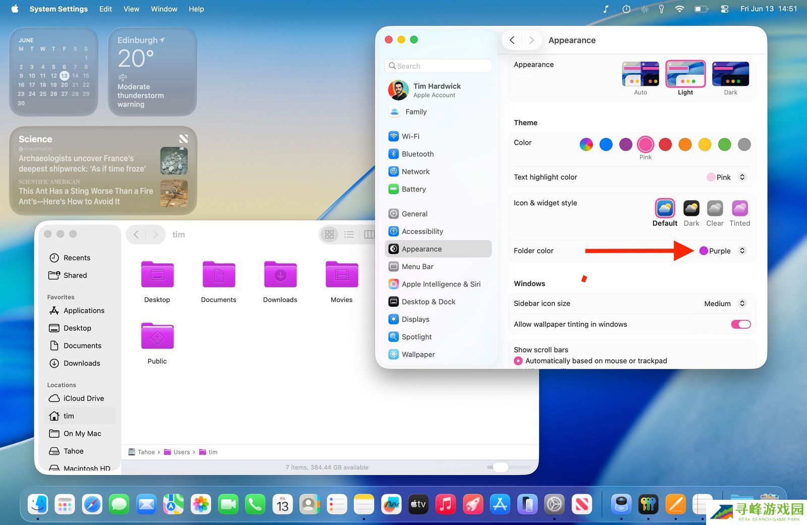 苹果还新增了“文件夹颜色”(Folder Color)设置,支持用户独立更改文件夹颜色。默认情况下,文件夹保持经典的蓝色外观,但切换到紫色等其他颜色后,系统范围内的文件夹将统一变色。
