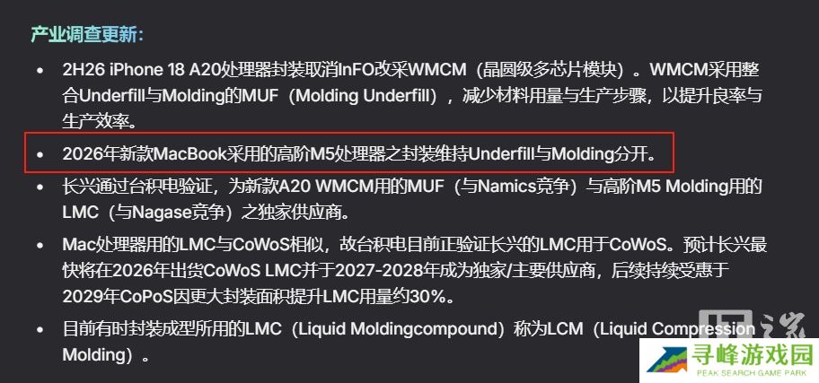 然而,郭明錤指出,2026 年的高端 M5 芯片(很可能是 M5 Pro 和 M5 Max 芯片)在生产过程中仍将保留独立的填充和成型工艺。他提及 2026 年的时间节点尤为关键,因为此前有传闻称搭载 M5 芯片的 MacBook Pro 将于 2025 年底发布。不过本站注意到,上个月彭博社记者马克・古尔曼曾报道,苹果正在“考虑”将搭载 M5 系列芯片的下一代 MacBook Pro 的发布时间推迟到 2026 年。