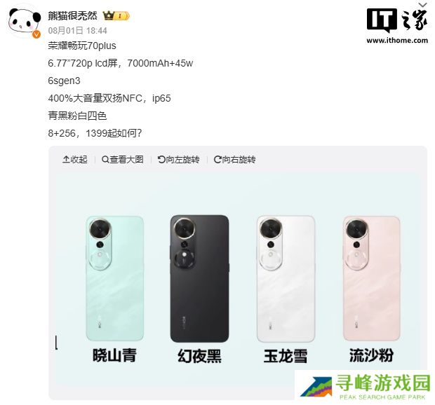 本站 8 月 2 日消息,博主 @熊猫很禿然 昨日曝光荣耀畅玩 70 Plus 手机部分参数,搭载 6.77 英寸 LCD 屏、7000mAh 电池。
