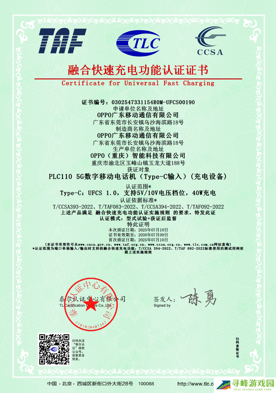 本站 7 月 31 日消息,FCA 终端快充行业协会今日宣布,OPPO 旗下一加 Ace 5 至尊版手机成功通过融合快速充电功能认证,获得行业首张 40W UFCS 融合快充认证证书,认证编号为 0302547331154ROM-UFCS00190,并已获得 UFCS 商标授权。
