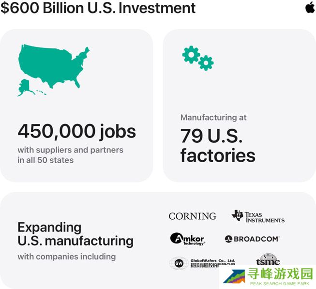 苹果公司首席执行官蒂姆・库克(Tim Cook)表示:“我们很自豪地宣布,苹果将在未来四年内将对美国的投资增加至 6000 亿美元,并启动全新的美国制造计划(AMP)。这一计划将包括与美国本土 10 家公司的新合作与合作拓展。这些公司生产的组件被广泛应用于苹果产品中,并在全球范围内销售。我们感谢总统对我们的支持。”