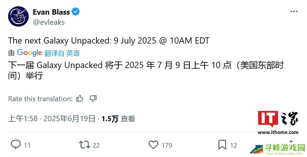 本站 6 月 19 日消息,消息源 Evan Blass(@Evleaks)昨日(6 月 18 日)在 X 平台发布推文,曝料称三星计划于美国东部标准时间 7 月 9 日 10 点(本站注:北京时间 9 日 22 点)在纽约召开。