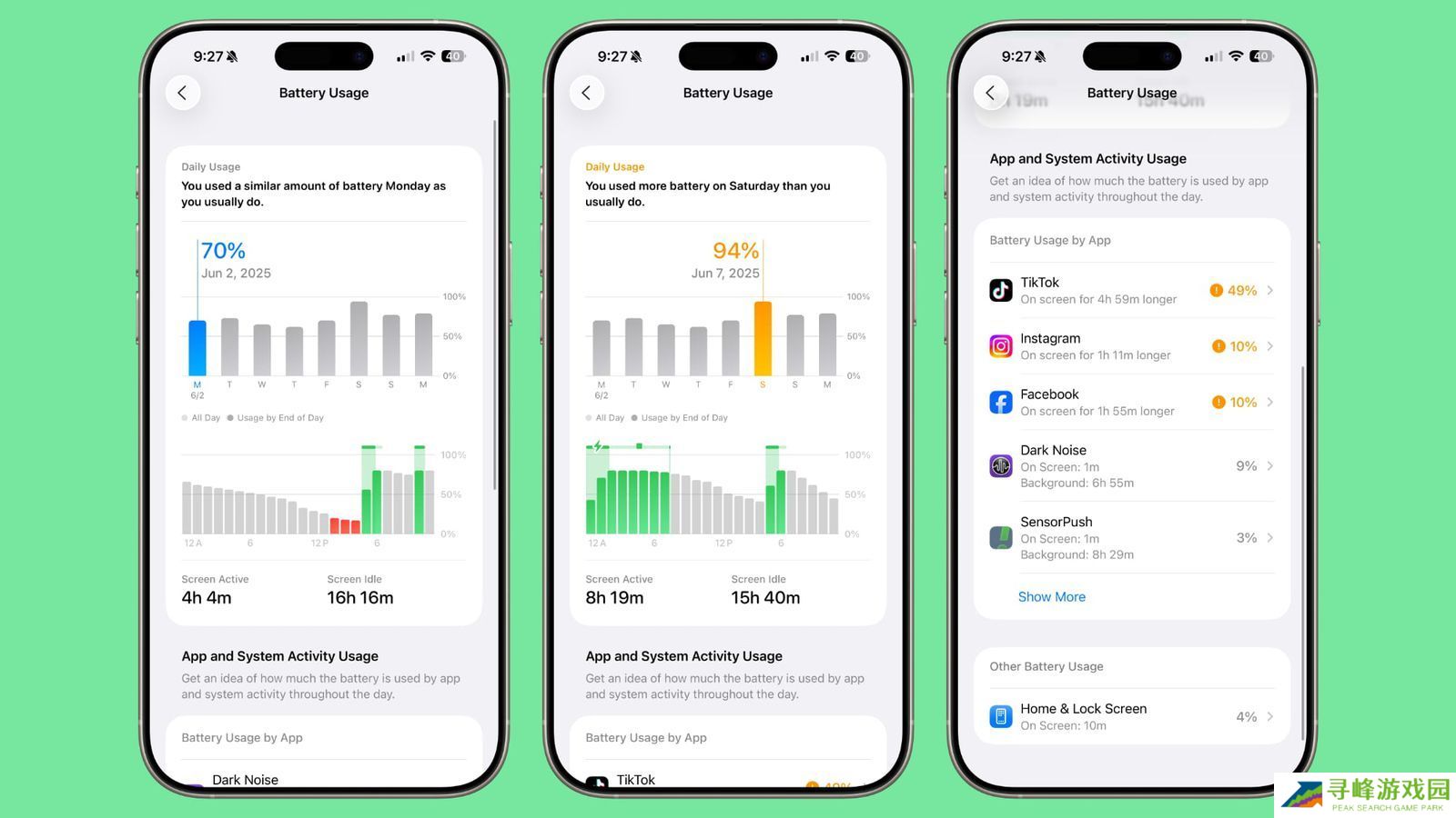此外,电池使用统计不再按 24 小时或 10 天划分,而是以周为单位展示平均用电量,并与用户的日常平均水平进行对比。这一新功能会明确告知用户当天的电量消耗是高于、等于还是低于平时,帮助识别耗电原因。