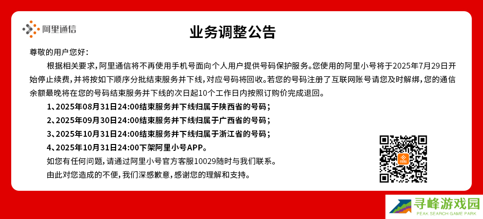 为切实保障用户的权益,充分考虑服务停用可能带来的不便,经审慎评估,我司决定在优化方案正式公布前,暂停执行原业务调整计划,确保用户在当前阶段除续费外,能够继续正常使用“阿里小号”服务。后续,我们将通过官方网站、App 等渠道第一时间同步最新进展,并另行通知具体业务下线安排。请用户关注更新公告,以获取最新信息。对于此次调整给您带来的困扰,我们深表歉意。如您有任何疑问,欢迎拨打官方客服热线 10029,我们将竭诚为您服务。