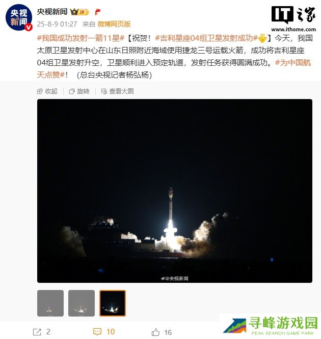 本站 8 月 9 日消息,北京时间 2025 年 8 月 9 日 00 时 31 分,由海阳总装出厂、中国运载火箭技术研究院抓总研制的捷龙三号遥六运载火箭,采用一箭十一星的方式,在山东日照附近海域成功将时空道宇公司“吉利星座 04 组”卫星发射升空,卫星顺利进入 LEO 轨道,发射任务获得**成功。