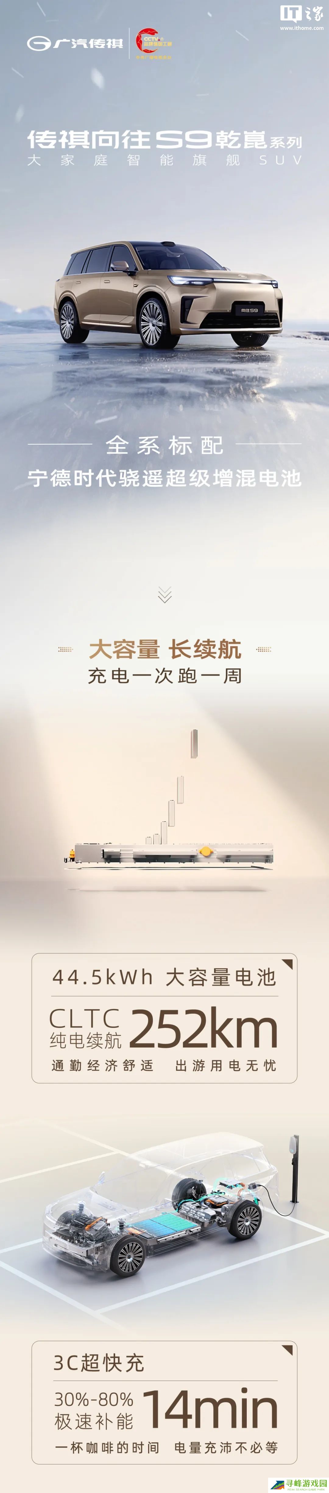 本站 8 月 13 日消息,据广汽传祺消息,向往 S9 大家庭智能旗舰 SUV 全系标配宁德时代骁遥超级增混电池,电池容量 44.5kWh、CLTC 纯电续航 252km。