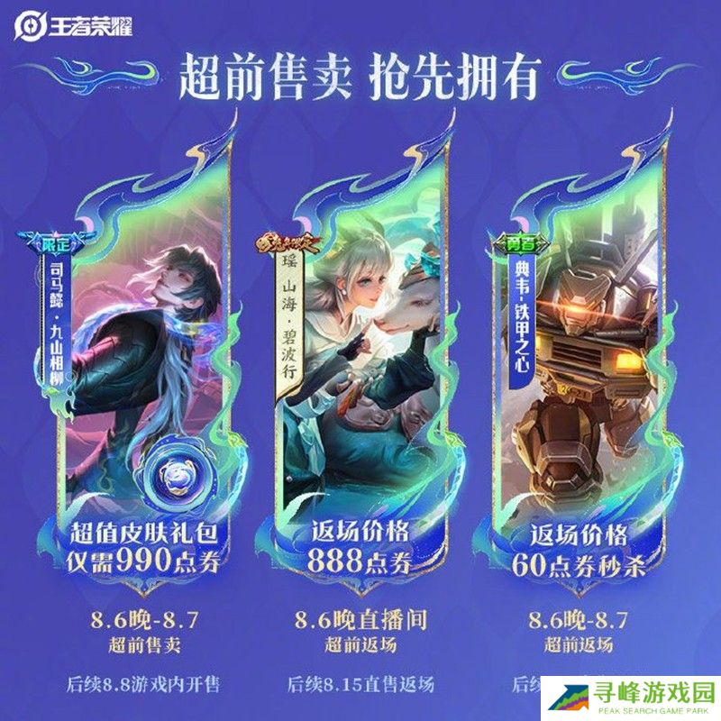 本次活动中,玩家们可以超前购买司马懿的全新皮肤“九山相柳”。这款皮肤属于传说限定品质,首周购买可以享受折扣,价格为990点券。此外,还有其他两款皮肤也将参与超前售卖,分别是“山海·碧波行”和“铁甲之心”,返场价格分别为888点券和60点券秒杀。