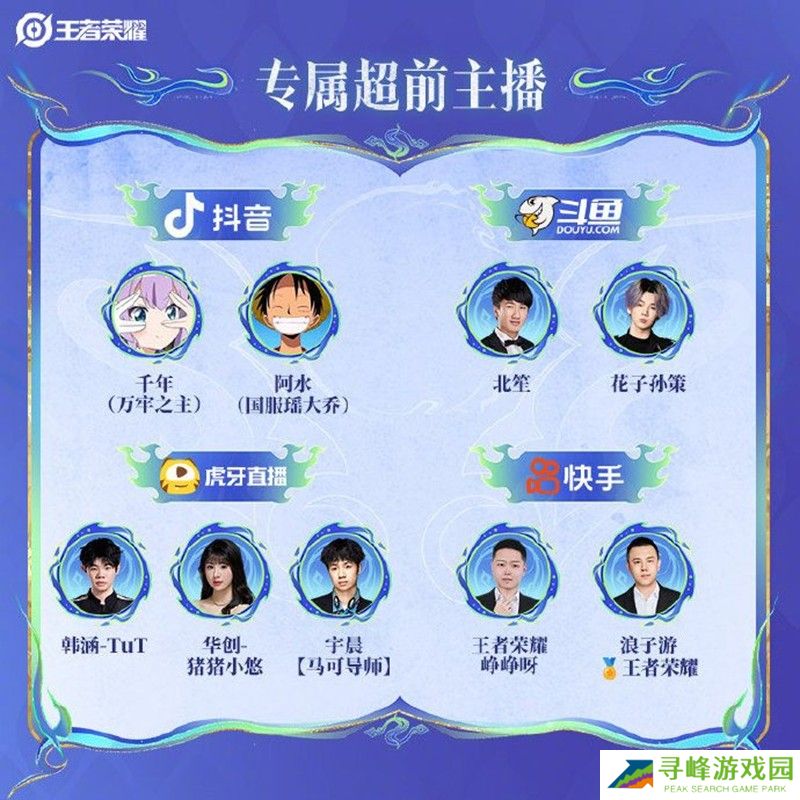 本次活动还邀请了多位知名主播参与,包括抖音的千年(万年之主)、阿水(国服瑶大乔)、北笙和花子孙策,斗鱼的拖米-TuT、华创-猪猪小悠和宇晨(马可导师),以及快手的王者荣耀峥峥呀和浪子游-王者荣耀。玩家们可以在这些主播的直播间中参与活动,享受更多惊喜福利。