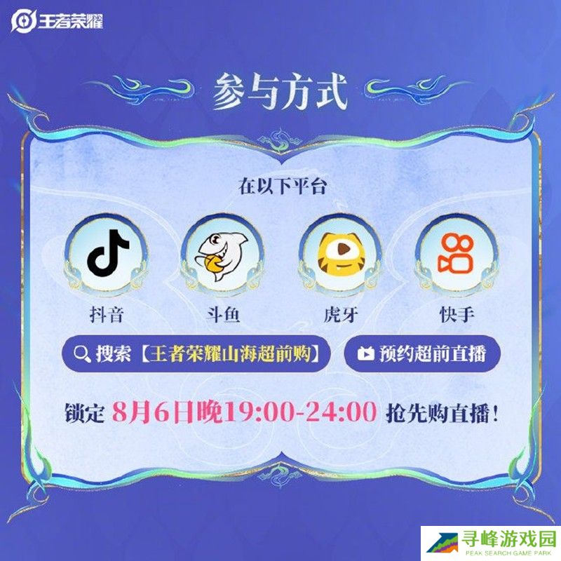 玩家们可以在抖音、斗鱼、虎牙和快手等平台搜索“王者荣耀山海超前购”或预约超前直播,锁定8月6日晚19:00-24:00的抢先购直播。在直播期间购买超前皮肤,还可以免费获得主播专属局内祝福语,穿戴皮肤开局可见,陪伴玩家上分顺利。