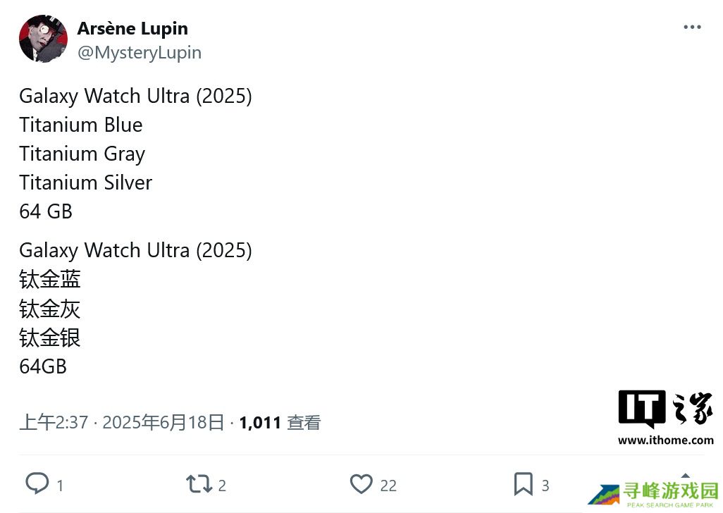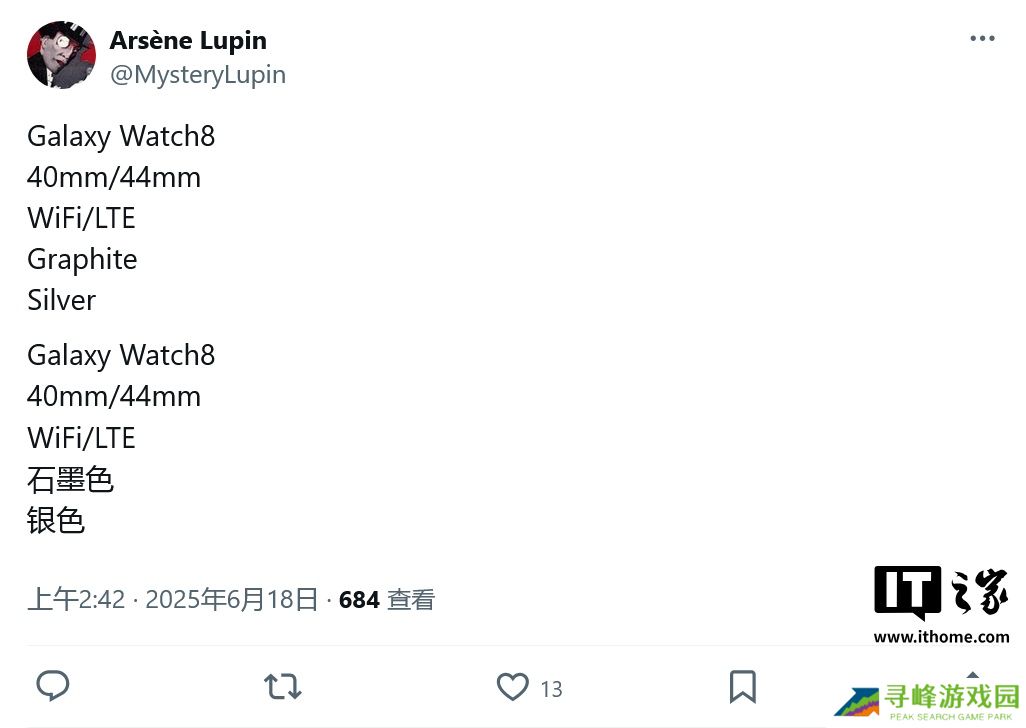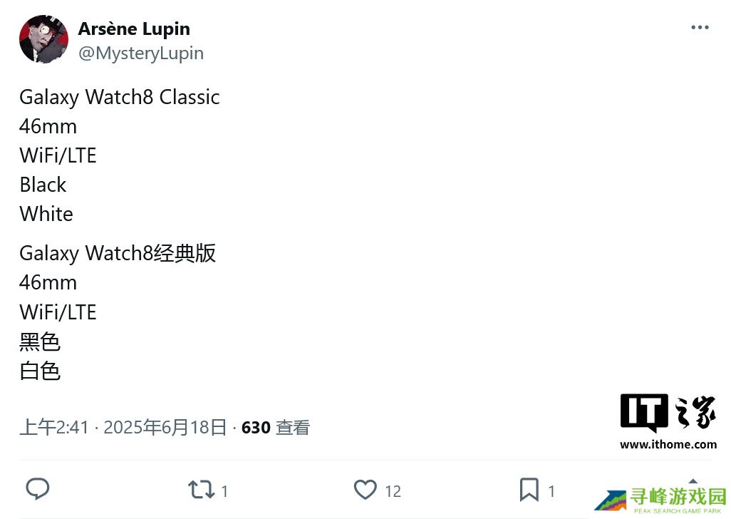 本站 6 月 18 日消息,消息源 @MysteryLupin 今天(6 月 18 日)在 X 平台发布推文,曝料称三星计划今年夏季发布 Galaxy Watch8 Classic 智能手表,仅提供 46mm 单一尺寸。
