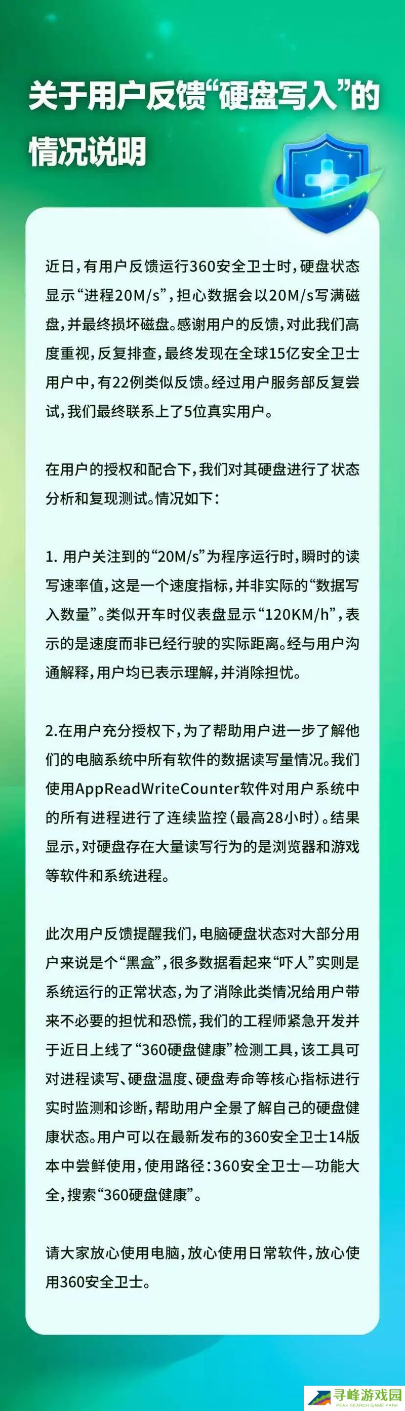 本站 8 月 1 日消息,“360 安全卫士”官方公众号昨日(7 月 31 日)发布公告,针对用户反馈运行 360 安全卫士时,硬盘状态显示“进程 20 M/s”情况作出说明。