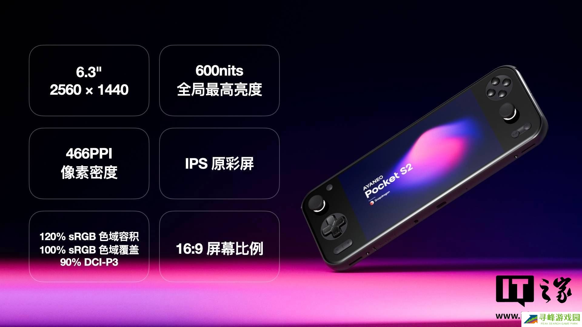 AYANEO Pocket S2 系列掌机升级配备 6.3" 2K IPS 原彩屏,更大画面视野与 466PPI 超视网膜级精度兼备,覆盖 120% sRGB 色域容积和 90% DCI-P3,支持 600nits 全局最高亮度。