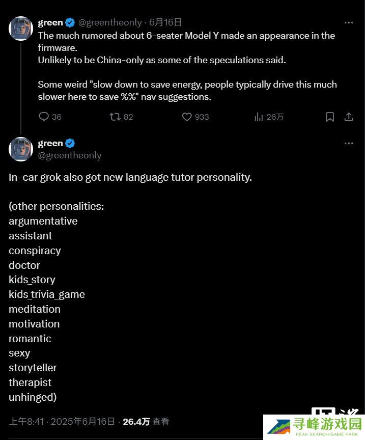 据特斯拉黑客“green”通过固件分析发现,特斯拉计划推出带有不同“个性”的 Grok 版本,这些个性将完全可定制,能够根据驾驶员的需求进行调整,从而提供更逼真的交互体验。此外,Grok 还将推出儿童版本,具备讲故事、玩猜谜游戏等功能。