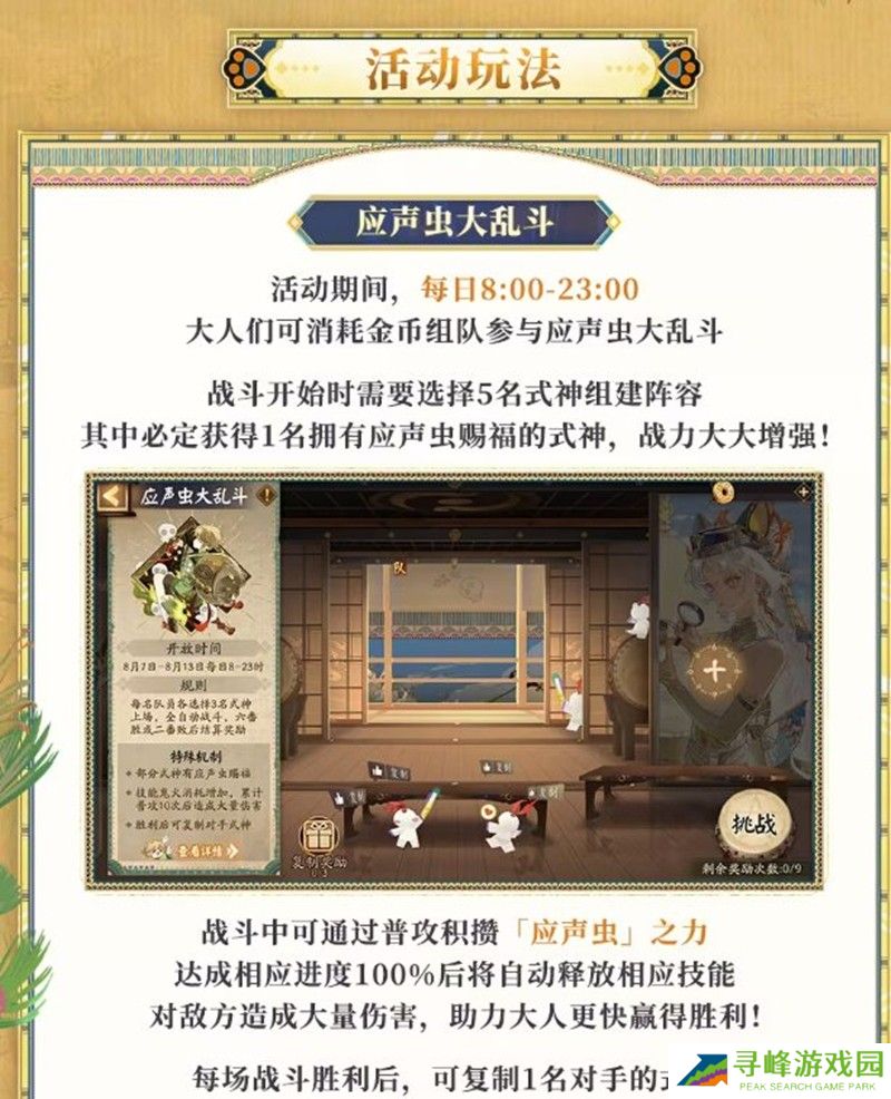 活动期间,每日8:00-23:00,玩家可以消耗金币组队参与应声虫大乱斗。战斗开始时,玩家需要选择5名式神组建阵容,其中必须包含1名拥有应声虫赐福的式神,以增强战斗力。
