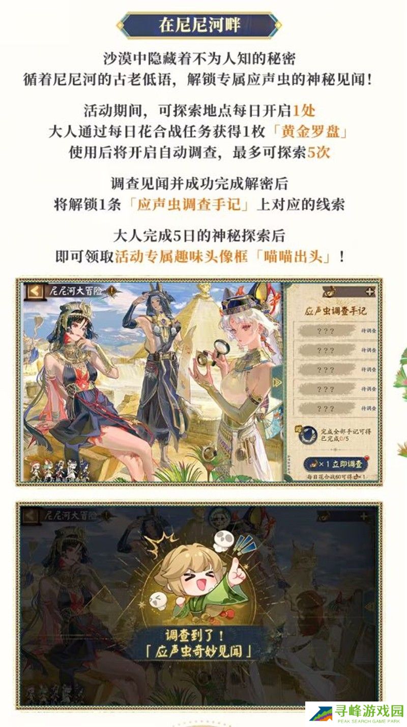 活动期间,玩家可以探索尼尼河畔的沙漠中隐藏的秘密。通过每日花合战任务获得1枚“黄金罗盘”,使用后将开启自动调查,最多可探索5次。调查见闻并成功完成解密后,将解锁1条“应声虫调查手记”上的对应线索。完成5日的神秘探索后,玩家即可领取活动专属趣味头像框“喵喵出头”。