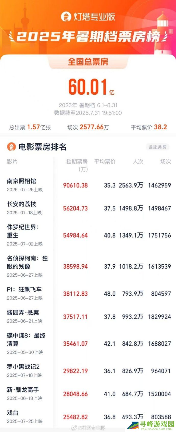 本站 8 月 1 日消息,据灯塔专业版,截至 7 月 31 日 19 时 50 分,2025 年暑期档(6 月-8 月)总票房(含预售)突破 60 亿,《南京照相馆》持续领跑暑期档票房榜。