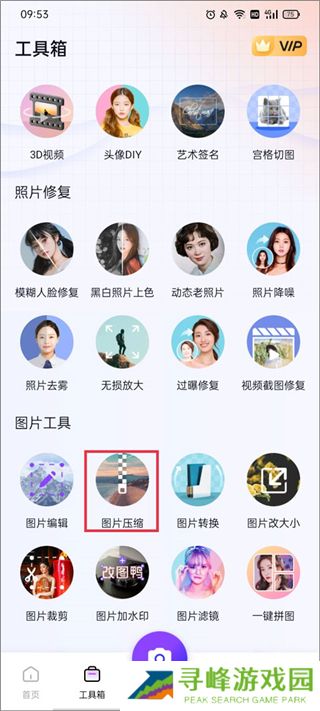 1、启动应用进入【首页】,选择【工具箱】页面,在图像处理分类中找到图片压缩功能并点击进入。