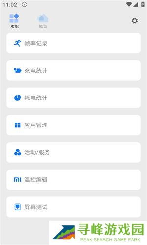 1、帧率记录,充电统计,耗电统计,应用管理,活动/服务,温控编辑屏幕测试。