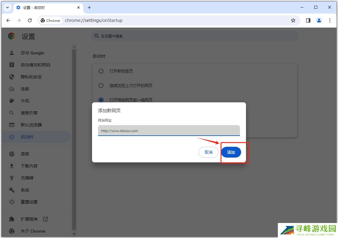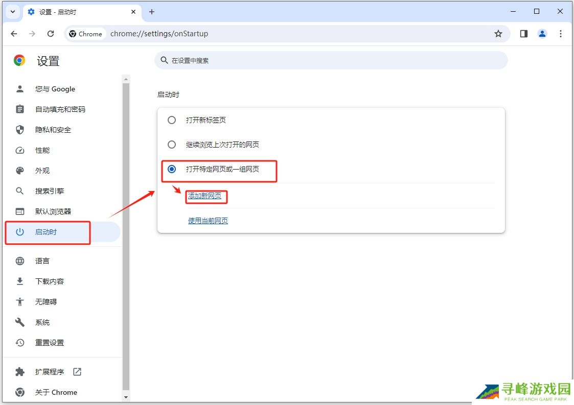 2、进入设置后,选择“启动时”——“打开特定网页或一组网页”——“添加新网页”;