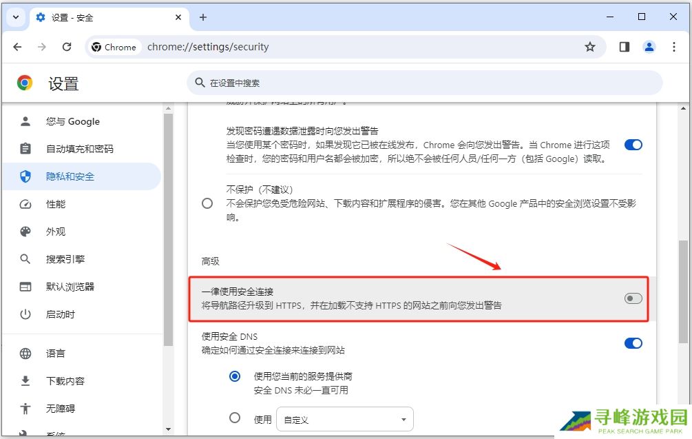 2、点击“一律使用安全连接”右侧按钮以启用该功能;