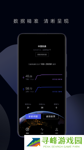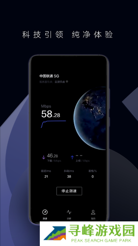 1、界面简洁无任何广告,并且背景设计是动态变化的地球,测速过程也更具“黑科技”感。