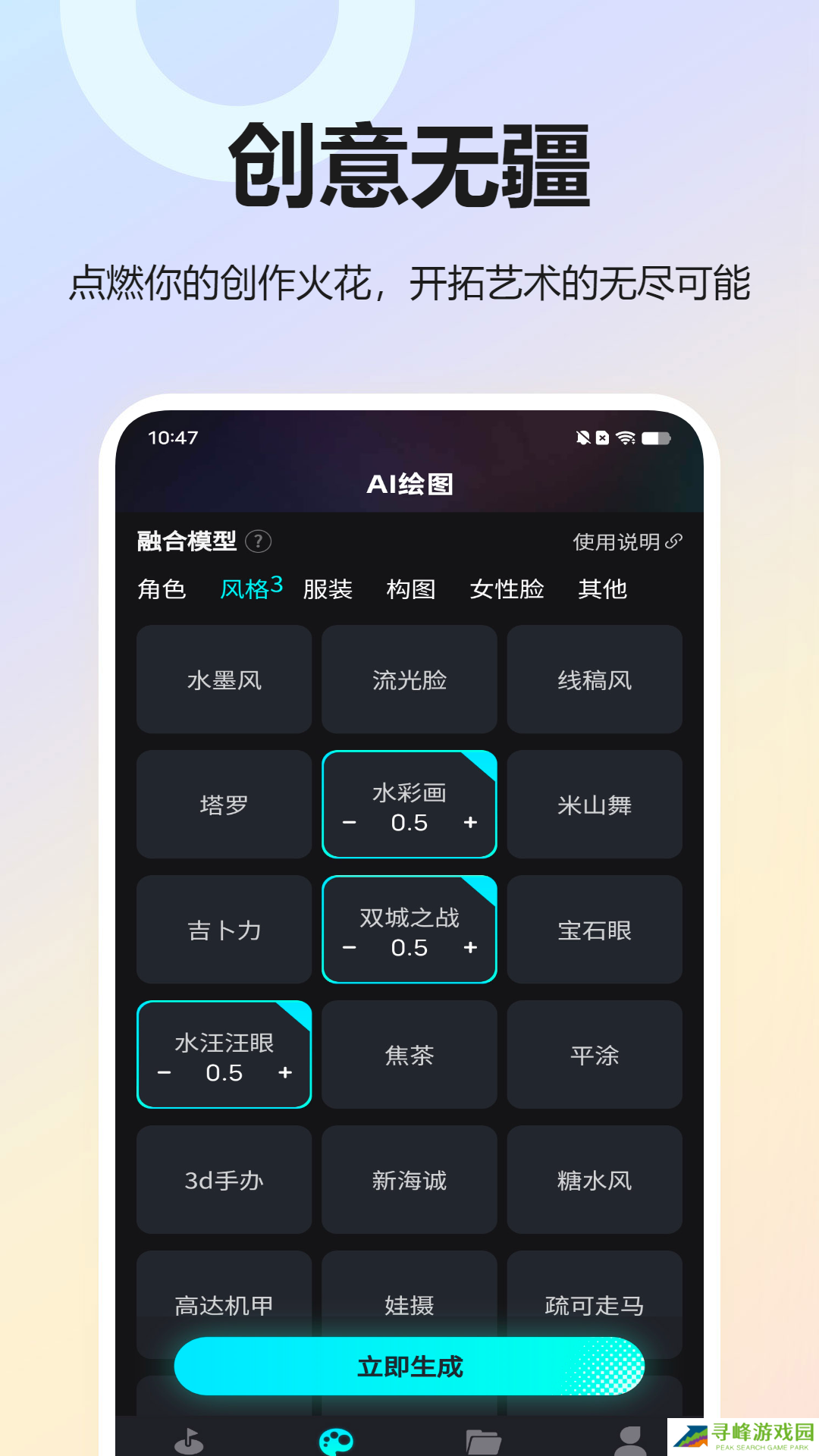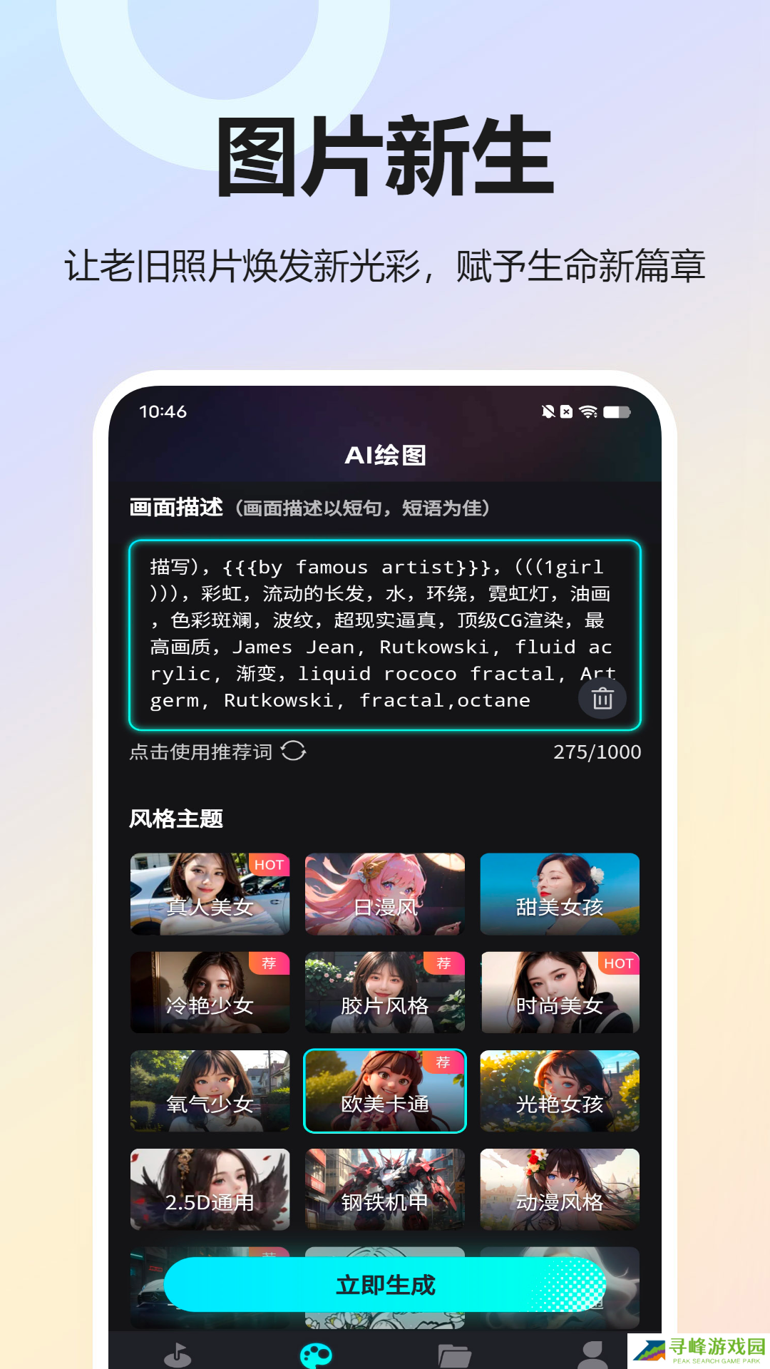 Playground AI是一款主打AI智能绘画的软件,依托GPTAI大模型与机器学习技术,只需将AI绘制图片的风格、构图、主题用文本输入,几秒种就能快速生成对应的美图,点燃绘画创作者们的创作火花,发现艺术中无限的可能。AI完成绘制的图片一键保存到手机本地,方便分享到QQ、微信等平台上,向好友们分享你的无限创意。还能借助AI将老照片破损、模糊的地方修复,让回忆重新焕发光彩。