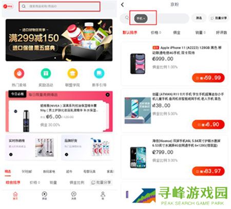 2、在首页顶部搜索框输入想推广的商品名称,选择对应产品,一键分享至社交平台;