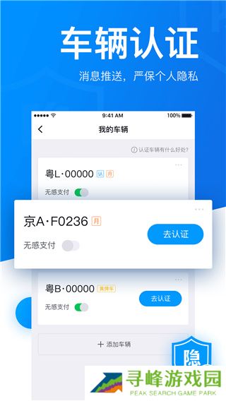 3、然后就完成绑定车辆操作了,为了保护隐私安全,车辆认证后可以查看真实车场名称,点击去认证上传行驶证就可以了。